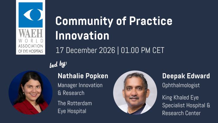 This CoP is led by Nathalie Popken, Manager Innovation & Research at the Rotterdam Eye Hospital (Rotterdam, the Netherlands) and Dr. Deepak Edward, Ophthalmologist at King Khaled Eye Specialist Hospital & Research Center (Riyadh, Saudi Arabia).