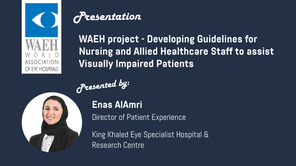 Enas AlAmri, Director of Patient Experience at the King Khaled Eye Specialist Hospital & Research Centre will present an update from their WAEH Project ‘Developing Guidelines for Nursing and Allied Healthcare Staff to assist Visually Impaired Patients’, which aims to create comprehensive, evidence-based guidelines to empower nursing and allied healthcare staff to better support visually impaired patients.