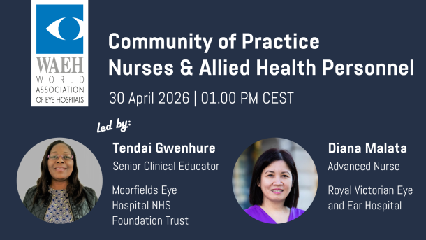 The Community of Practice – Nurses is for all nurses and allied health staff working in eye hospitals worldwide. Topics like task differentiation, pain medication and ophthalmic training for nurses worldwide are discussed.
