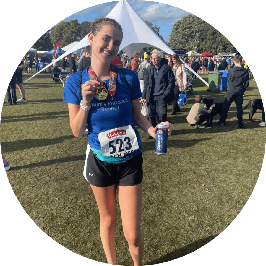 “It means I can now run guided with a group, though I’m not yet ready to run alone. In October 2023, I ran the Loch Ness Marathon alongside my dad and an excellent team of friends”.